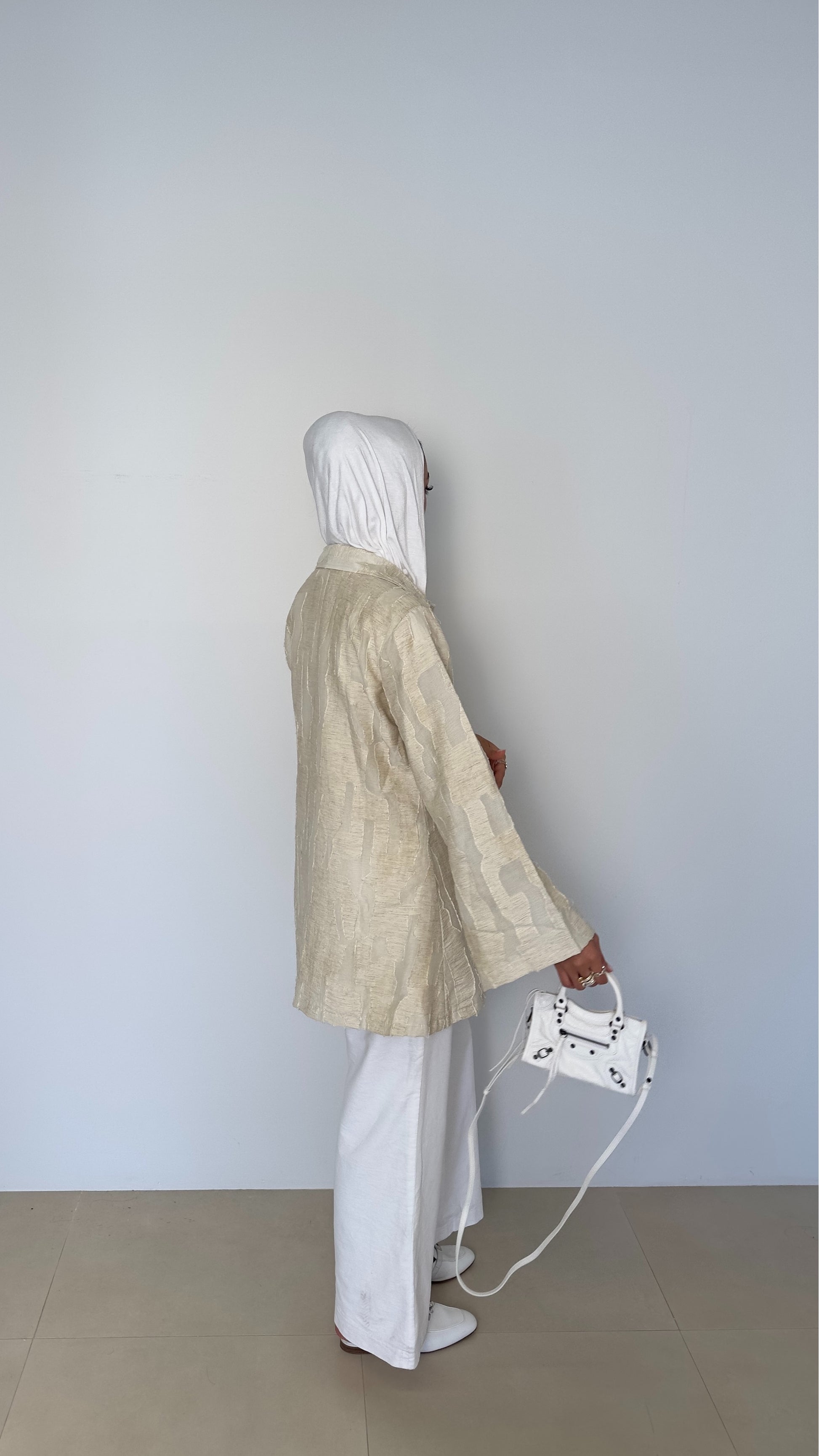 توب بخامة مموجة باللون البيج الأنيق، بتصميم مريح بطول 33 إنش. مثالي للتنسيق مع بناطيل رسمية أو إطلالات كاجوال، ليمنحك مرونة تناسب العمل واليوم اليومي.
