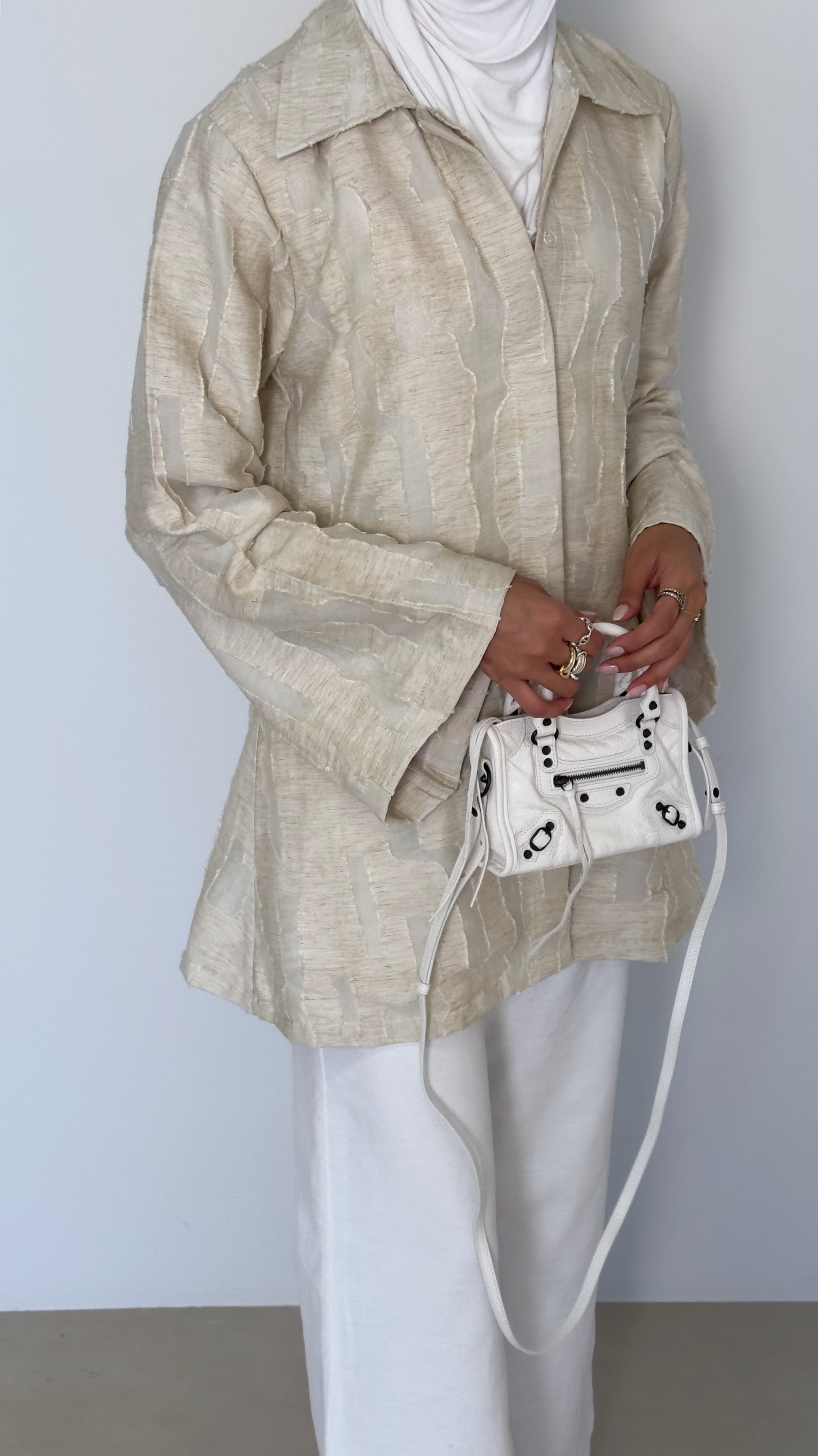 A textured top in an elegant beige shade with a relaxed fit and a length of 33 in. Perfect for pairing with tailored pants or casual looks, making it versatile for both office hours and everyday outings.